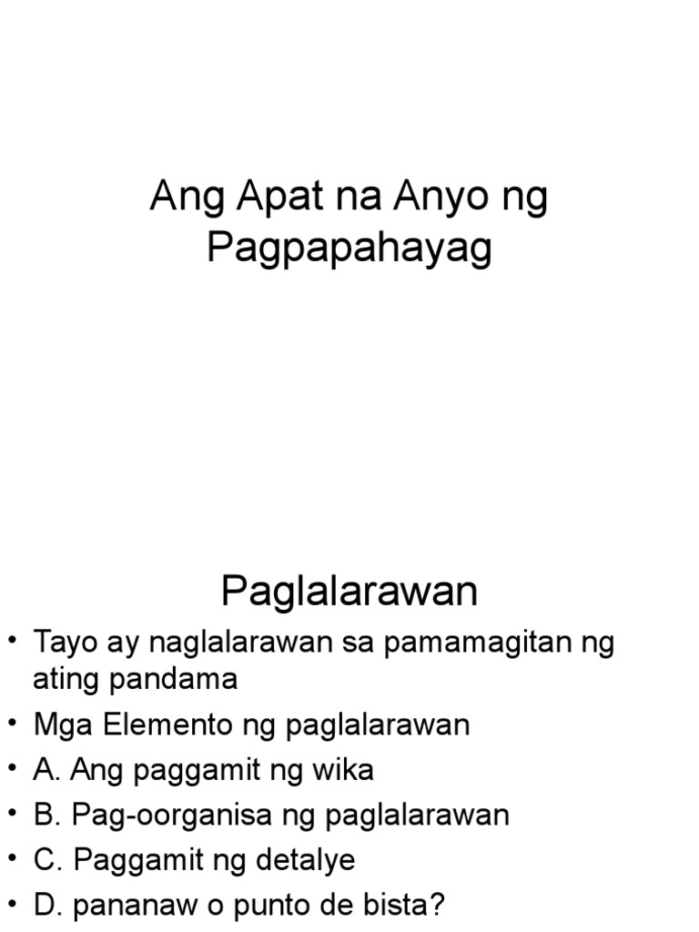 Nasa iyo ang paglahad ng maliwanag at tiyak at dapat. PAGLALARAWAN - Itoy isang anyo ng pagpapahayag na naglalayong bumuo ng isang malinaw na larawan sa isip ng mga mambabasa o nakikinig. Apat na Paraan ng Pagpapahayag ng Diskurso by Sky Anne.