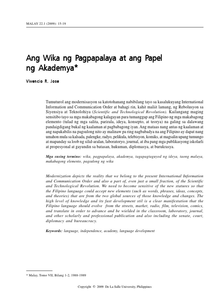 Ito ay nalilikha ng dahil sa heograpikonog kinaroroonan. 16 MALAY TOMO XXII BLG. Angkop na tatalakayin ang papel ng akademya sa layuning ito dahil sa penomenal na paglaganap ng Filipino sa buong bansa nang nakaraang mga dekada.