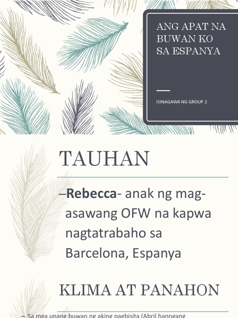 Basahin at unawain ang Sanaysay Ang Apat na Buwan ko sa Espanya Ako si Rebecca labing-anim na taong gulang anak ng mag-asawang OFW na kapwa nagtatrabaho sa Barcelona Espanya. BUWAN KO SA ESPANYA. Taong 1892 na ngayon at ilang buwan na lang malapit na mabuo ang isang samahan na magwawakas sa ilang siglong pagpapahirap at pananakop ng mga Espanyol.