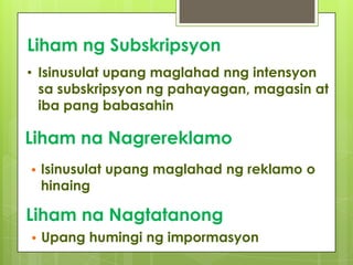 LIHAM PANG NEGOSYO Ito ay isang pormal na sulatin na karaniwang ginagamit sa taong nasa labas ng organisasyon o kompanya. Magbigay ng ibat ibang uri ng liham pangangalakal. Mga Uri ng Liham.