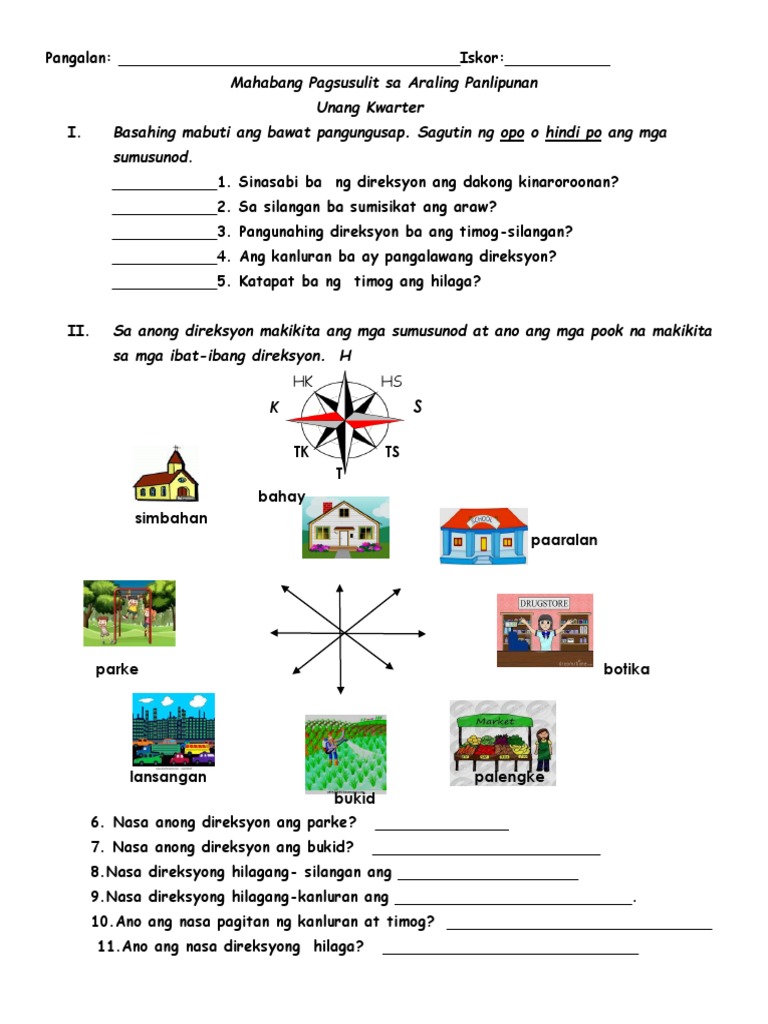 Basahing mabuti ang mga tanong. Hilaga north timog south silangan east kanluran west. Ano ang pangunahing direksyon ng mapa.